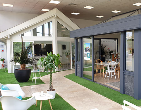 Venez visiter notre showroom de 200 m² et découvrez nos vérandas, extensions, pergolas et auvents en conditions réelles. Bureau, cuisine, salle à manger, espace détente… Tout est possible.
