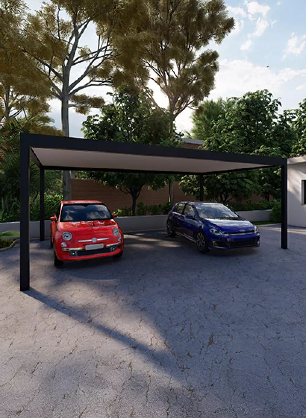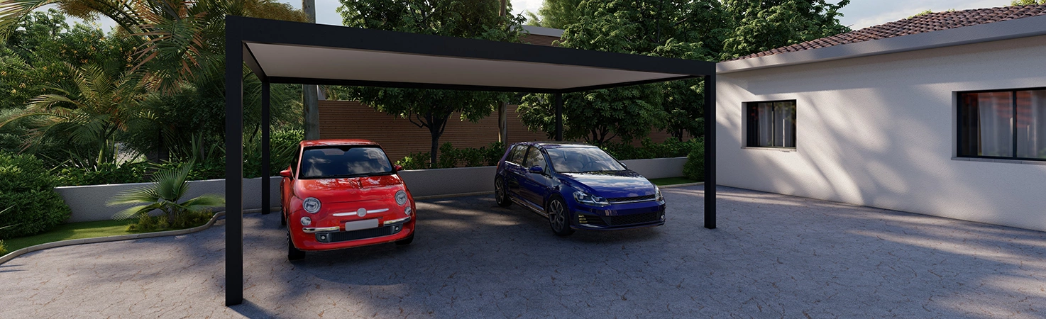 Si vous avez deux véhicules (ou si vous voulez garder une place pour les vélos et la moto), le carport double s'impose. En stationnant vos voitures côte à côte sous une structure unique de 5 à 6 mètres de large, vous créez un véritable espace logistique harmonieux. C’est souvent plus esthétique et plus économique que d'installer deux petits abris séparés.