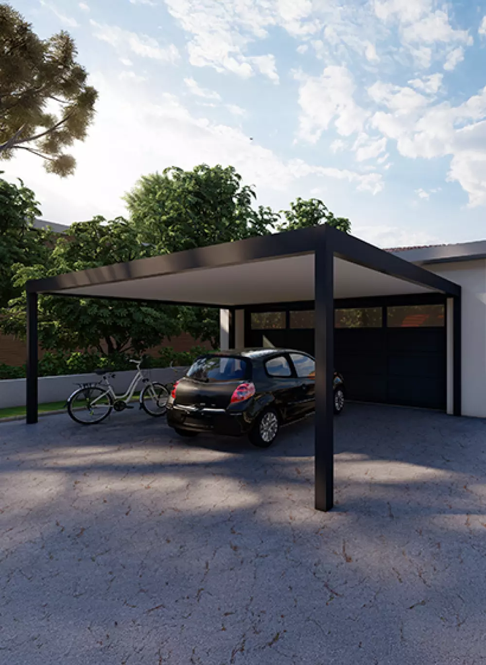 L’abri de voiture offre également une grande souplesse d’implantation. Il peut être installé à proximité immédiate de la maison, dans une cour, au fond d’un jardin ou encore près d’une entrée de propriété.