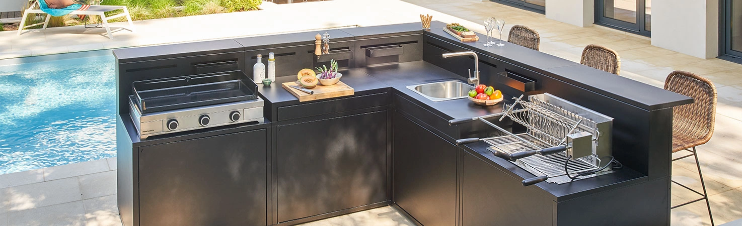 Votre future cuisine d’extérieur devra être implantée de manière stratégique, à proximité de votre maison pour éviter les allers-retours ou a minima, à proximité des raccordements d’eau et des arrivées électriques pour simplifier les travaux annexes et profiter d’une cuisine 100 % fonctionnelle.