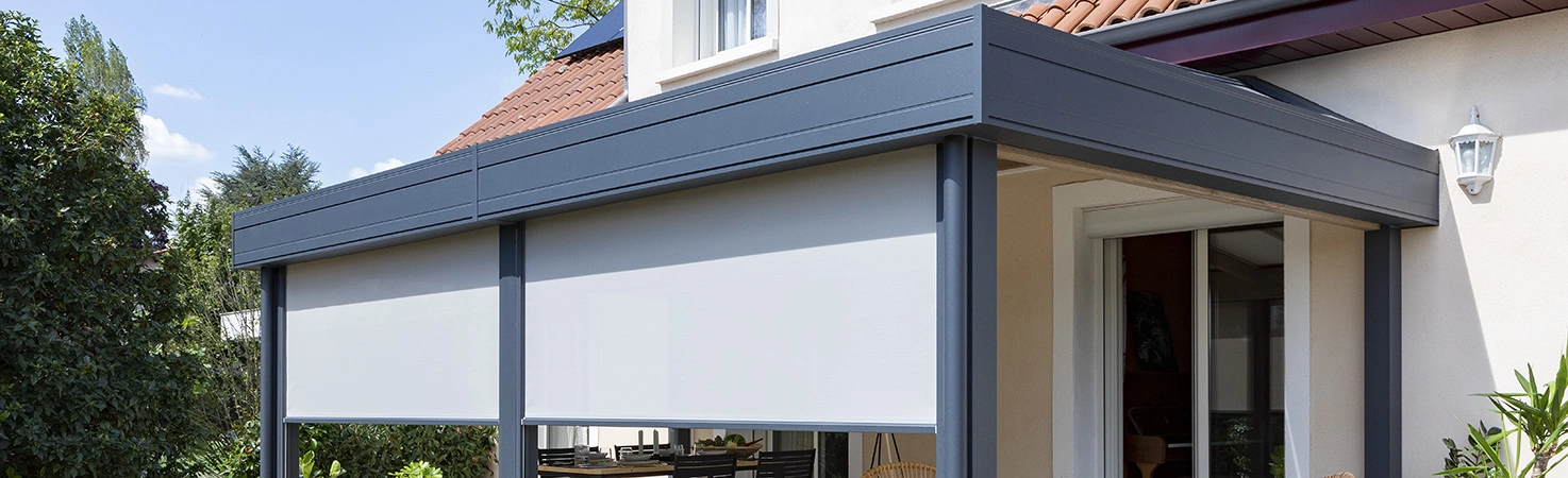 Afin d’atténuer les rayons du soleil tout en conservant une vue partielle de son extérieur et de son jardin, il est possible – sur certains modèles de terrasses couvertes – de fermer sa pergola de jardin avec un système de toile ou parfois de stores.