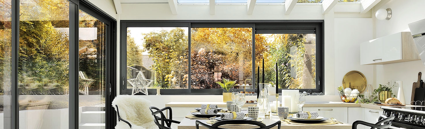 Une cuisine dans une véranda verrière