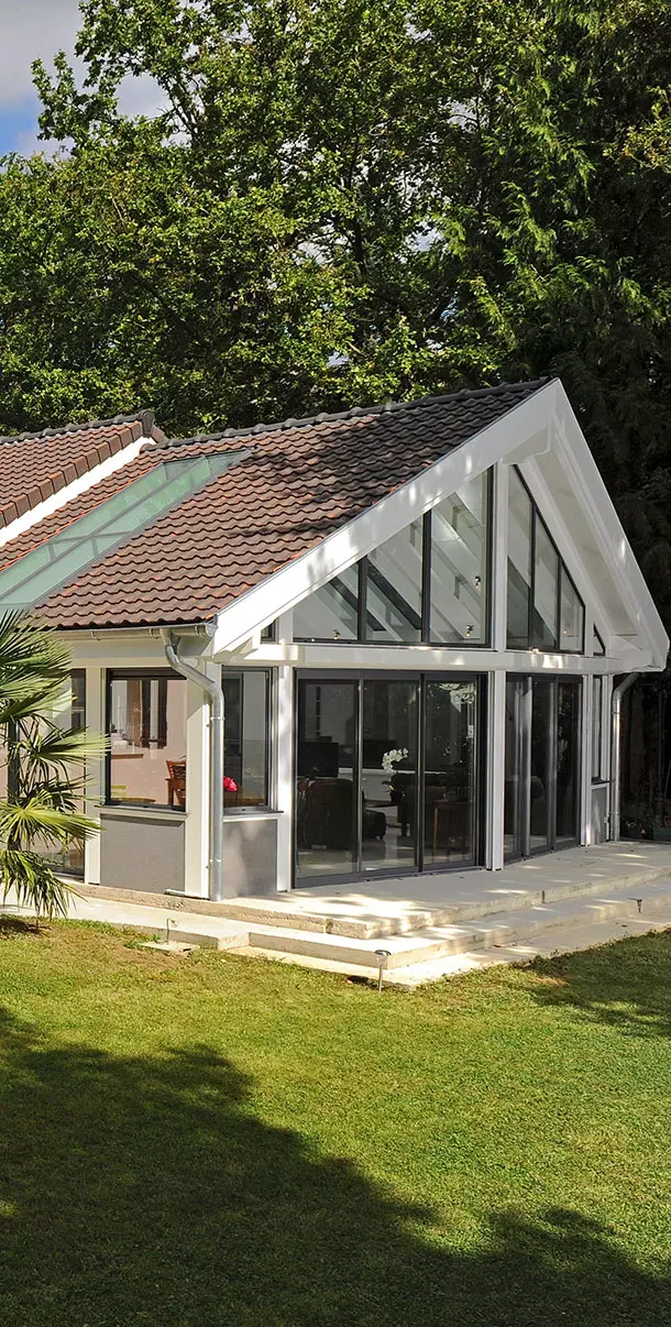 Linda est une belle extension en bois blanc, avec une grande hauteur sous plafond qui s’étend sur les deux étages de la maison. La couverture en tuiles avec trames de verre apporte une isolation thermique optimale pour en profiter en toute saison.