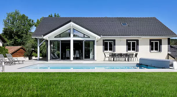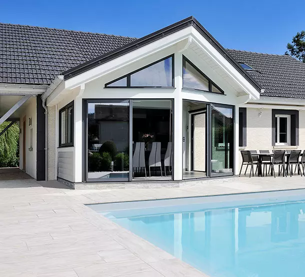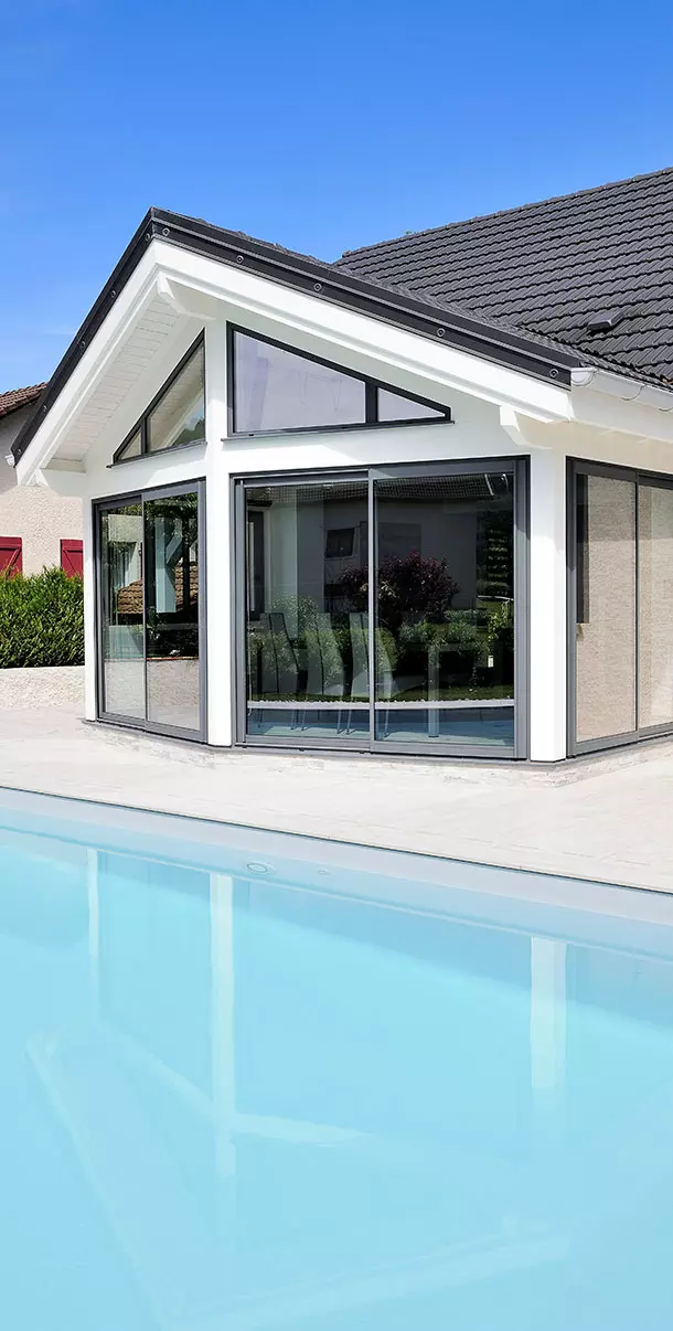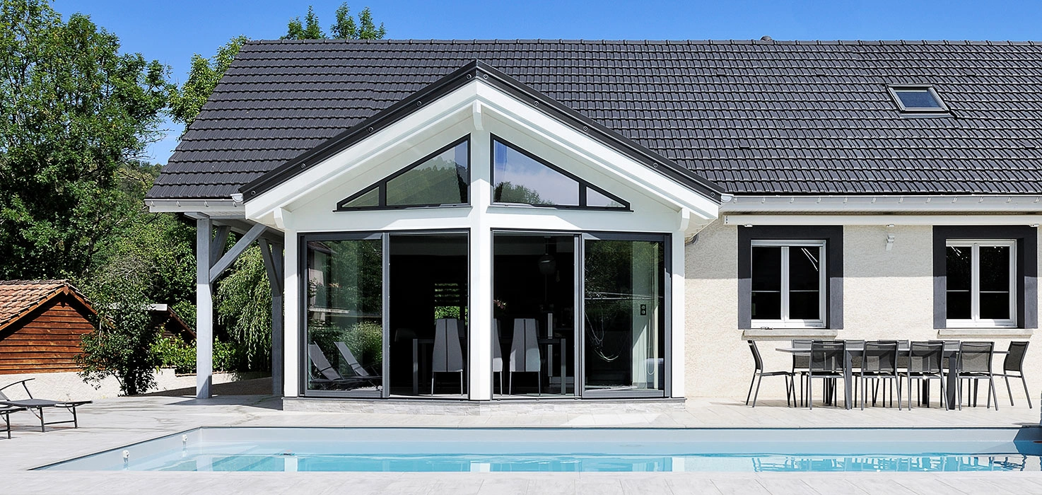 Cette extension bois, on dirait qu’elle a toujours été là. Et pour cause : l'extension Livia s’intègre à la perfection à son coquillage ! Source de confort supplémentaire au quotidien, il suffit d’ailleurs d’ouvrir ses grandes baies vitrées pour se retrouver… dans la piscine.