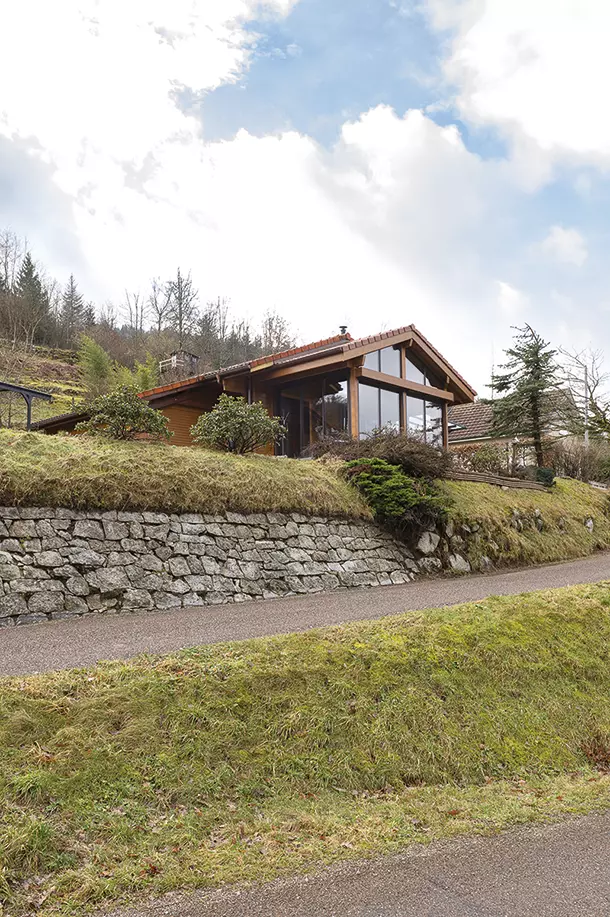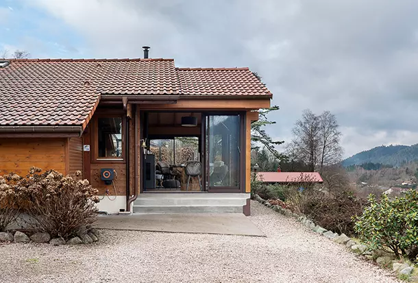 Implantée à flanc de montagne et entourée de sapins, cette extension en bois inspiration chalet s’intègre naturellement à son environnement. Son coloris chêne doré, aux nuances chaleureuses et authentiques, fait écho aux codes de l'architecture montagnarde et permet une parfaite harmonie avec le paysage.
