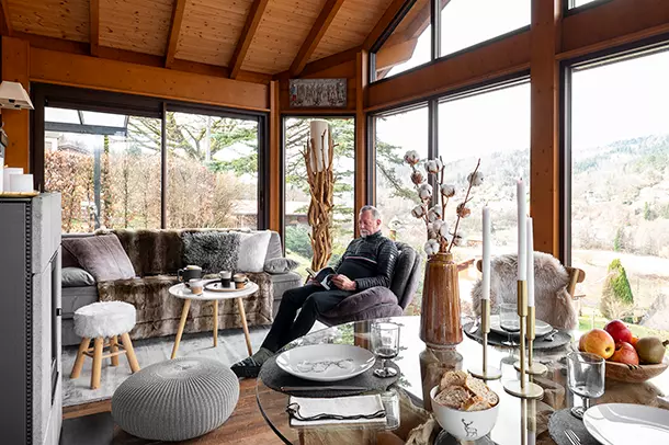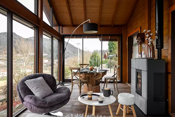 À l’intérieur, l'extension dévoile une atmosphère douce et enveloppante, pensée comme un véritable refuge hivernal. Installé bien au chaud, un chocolat fumant entre les mains, on profite du spectacle apaisant de la neige qui recouvre les sommets. Moments de détente absolue ou instants partagés en famille, cette extension bois chaleureuse se vit pleinement au fil des saisons, même au cœur des hivers les plus froids.