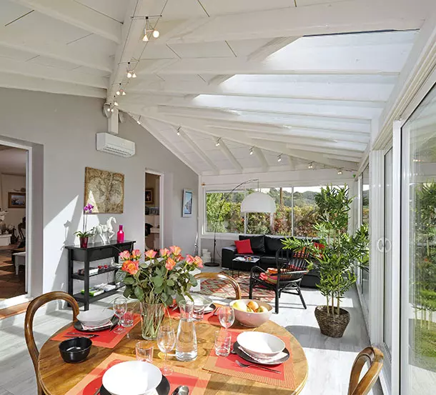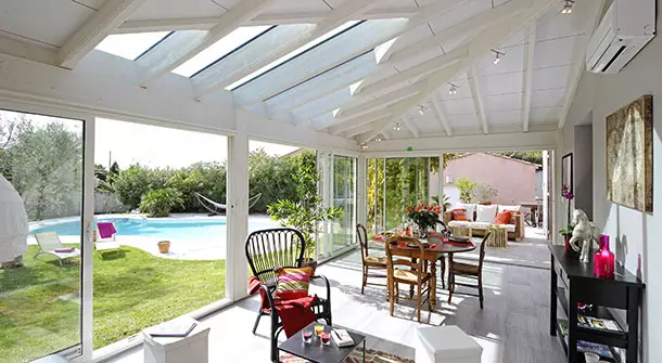 L'extension de maison Provencia se présente comme une vaste pièce en bois blanc, polyvalente, qui maîtrise l'art du détournement pour se transformer tour à tour en salon, salle à manger ou espace de détente. Avec des touches telles que des plantes, des bougies, des roses et des tableaux, elle est aménagée pour devenir une pièce à vivre idéale au quotidien.