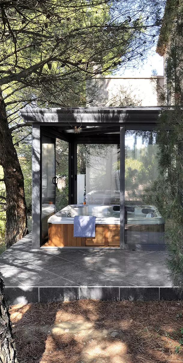 Derrière les grandes baies vitrées de ce jardin d'hiver aménagé en spa, la vie devient plus douce, au grès des moments de détente et de bien-être. Un espace 100 % cocooning pour profiter de son jardin toute l'année !
