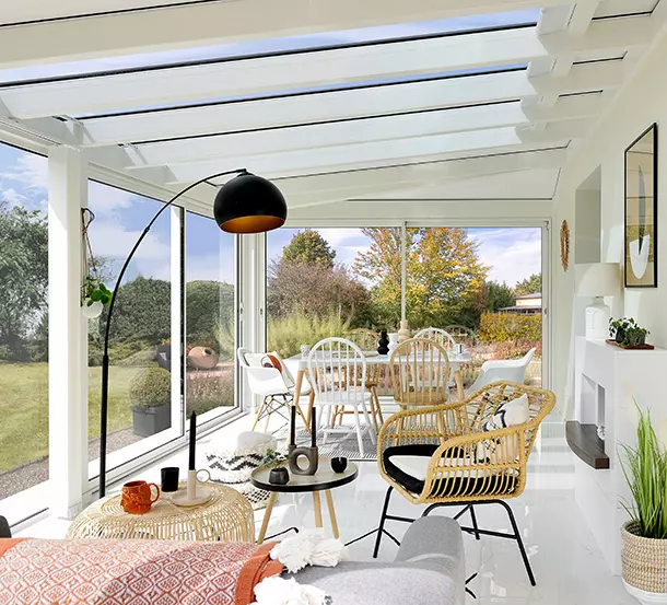 Avec ses larges ouvertures vitrées en façade et ses belles trames de vitrages en toiture, la véranda Hanaé est une source naturellement lumineuse de bonheur, qui révolutionnera votre quotidien.