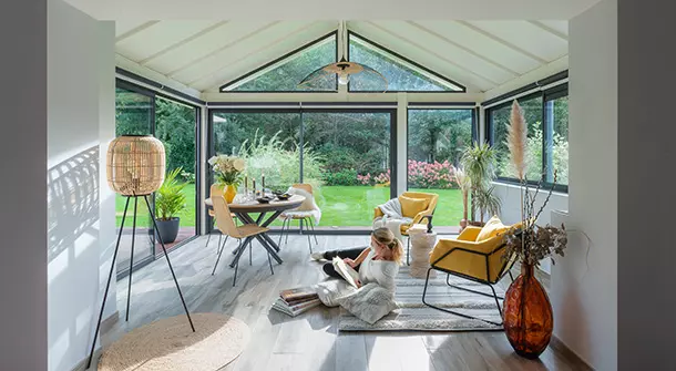 À l'intérieur, la véranda bois Diana n'est pas en reste avec une pièce parfaitement ouvertes sur la nature environnante grâce aux larges ouvertures vitrées coulissantes.