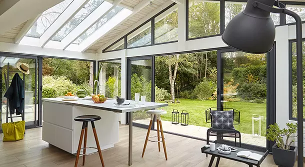 Grâce à cette véranda bois cuisine s'ouvrant sur l'espace extérieur, vous pouvez profiter pleinement de votre jardin et de la lumière naturelle en toute saison tout en concoctant des bons petits plats où en lisant un bon livre dans votre séjour. C'est un espace charmant pour passer d'agréables moments en famille ou entre amis.
