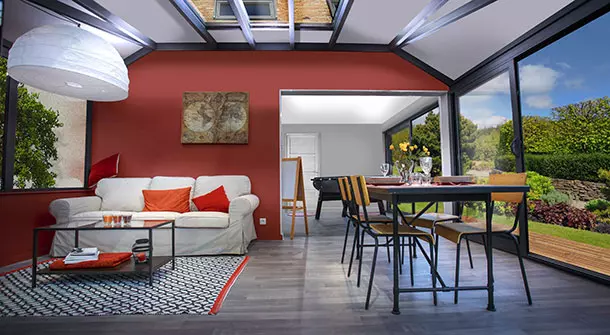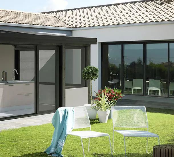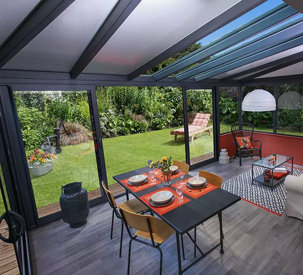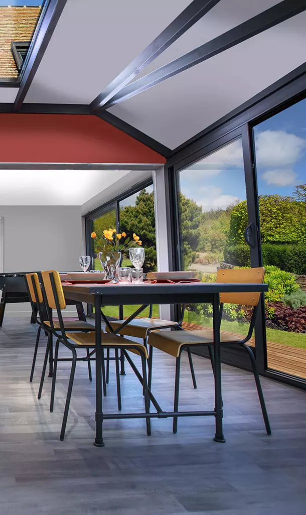La véranda Alix ne s’arrête pas simplement à son bel esthétisme. L’ossature bois, l’isolation de toiture et les châssis en aluminium à rupture de pont thermique à double barretage qui la compose la rende ultra performante thermiquement et phoniquement.