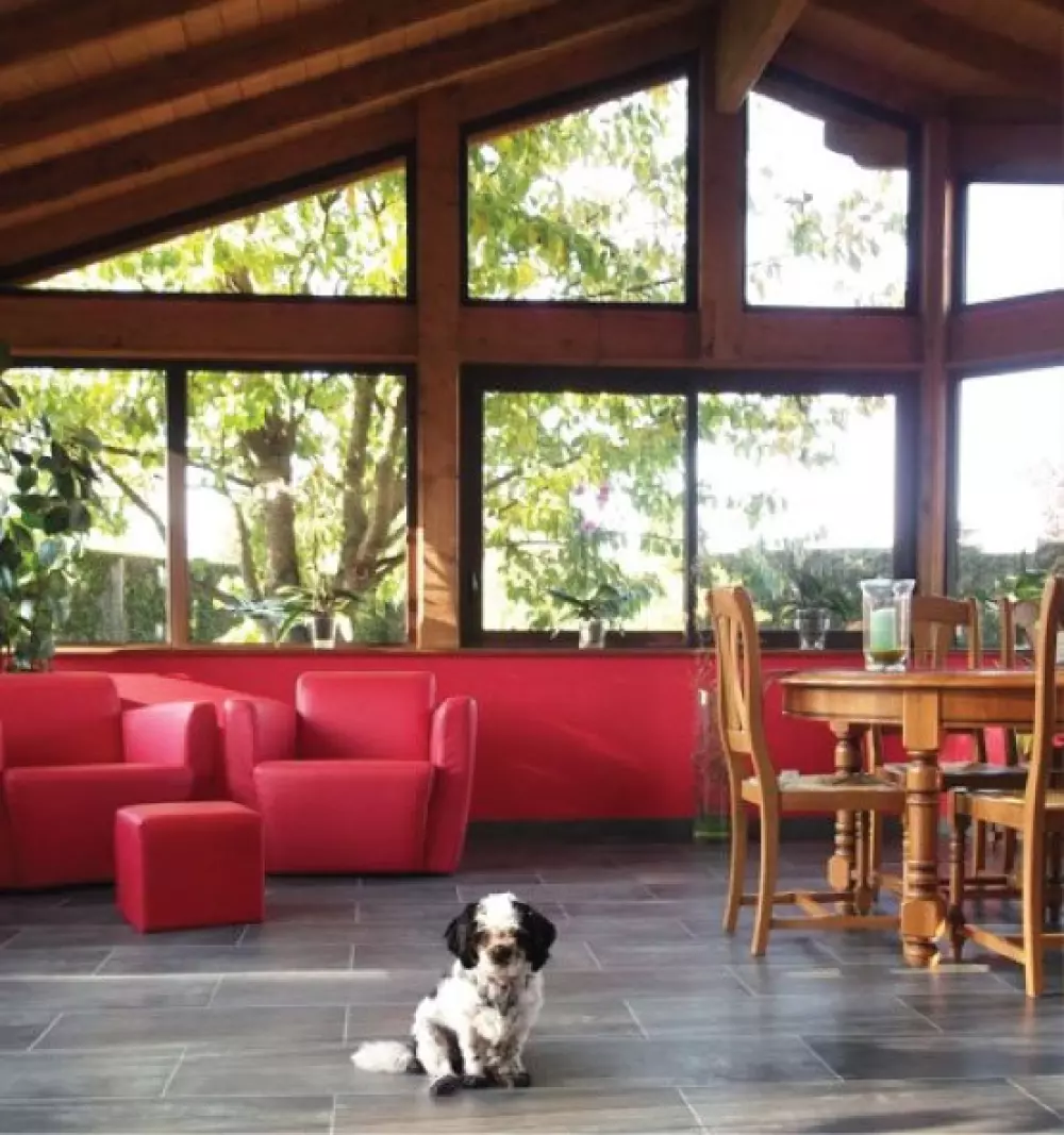 "Notre véranda nous l’avions souhaitée spacieuse, confortable, et dans un souci d’intégration avec notre maison, en bois avec une couverture tuile.